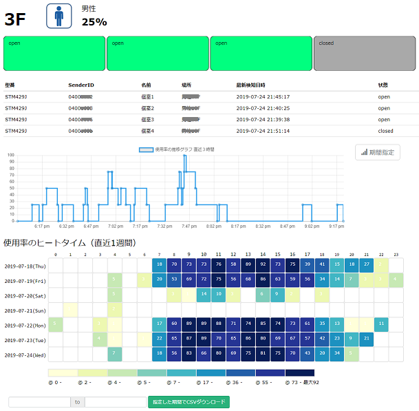 - 画面下部は「トイレ使用率ヒートマップ」です。トイレの混雑する時間帯は濃い色で表示されます。期間を指定して、ヒートマップの元データをCSVダウンロードが可能です。